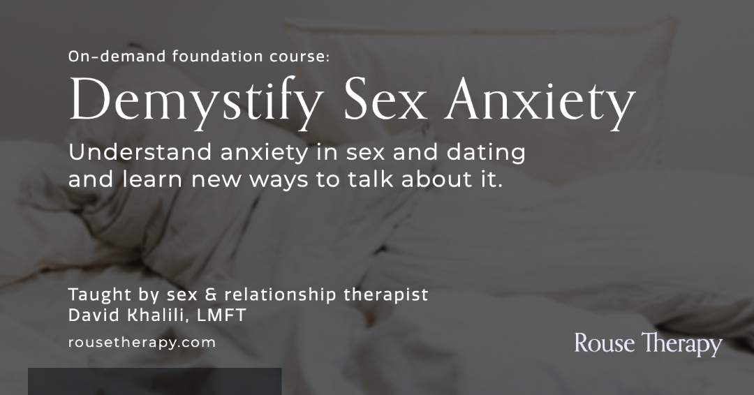Rouse recently released our mini-course called “Demystify Sex Anxiety,” a 90-minute course on understanding how anxiety impacts your sex life, ways to reduce sex anxiety, and direct ways to talk about sex anxiety with a partner. Use coupon code ROUSE15 for 15% off!